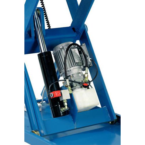 - Stalen tafels, afgewerkt met blauwe epoxylak, gemonteerd op hydraulische vijzel.