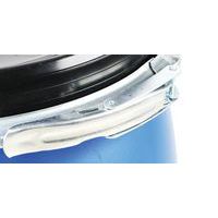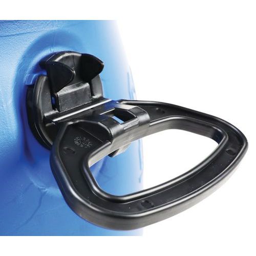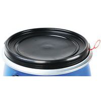 Cilindervormig vat PEhd, voor veilige opslag en transport. Deksel met pakking en gegalvaniseerde stalen zegelring met verzegelbare hendel. VN-homologatie voor het vervoer van gevaarlijke stoffen. Zwart deksel met EPDM-afdichting. De modellen van 120 l en 200 l hebben geen grepen.