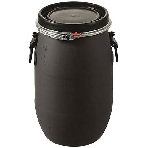 Praktisch dankzij de gedeeltelijke opening. Gerecycled vat dat geschikt is voor de sectoren industrie, chemie en afvalrecycling. Biedt een alternatief. Optimale veiligheid, goedgekeurd voor het vervoer van gevaarlijke stoffen volgens de VN-regelgeving. Het vat kan verzegeld worden via de metalen ring.