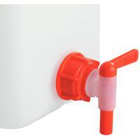 Eenvoudig te verplaatsen vat met kraan, met 1 metalen handgreep of 2 kunststof handgrepen. Gegarandeerd waterdicht met de grote rode schroefdop met afdichting. Aftapkraan kan worden vervangen door een kleine rode stop. Uitlaat-Ø kraan: 10 mm.