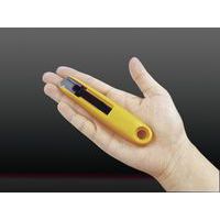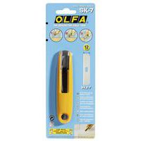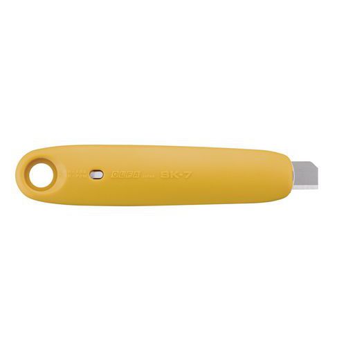 Veiligheidsmes, zakmodel, Olfa SK-7, stalen afbreekbaar lemmet. Stalen lemmet, afbreekbaar en omkeerbaar. Voor het openen van dozen bij recepties, magazijnen, werkplaatsen en winkels. Maximale veiligheid dankzij het automatische intrekmechanisme. Compact en licht design.