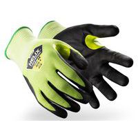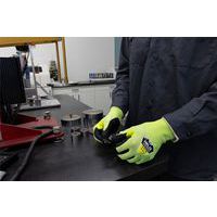 - Helix 3062 snijbeschermingshandschoen (niveau F), 18 HPPE / staalvezel ondersteuning, nitrilschuim palmcoating voor hechting in droge en vochtige omgevingen, hoge zichtbaarheid kleur, compatibel met aanraakschermen.