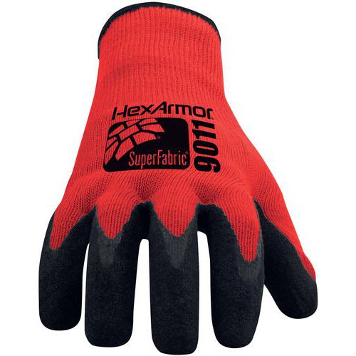 Beschermende handschoen HexArmor 9000 Series 9011 hoge prestaties tegen snijwonden (niveau F volgens EN 388) en industriële perforatie met HPPE / glasvezel ondersteuning, dubbele superfabric® materialen en gecrêpede latex palm coating met goede gripcapaciteit in droge en vochtige omgevingen.