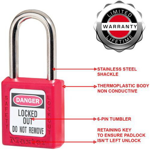 Veiligheidshangslot, Kleur: Rood, Breedte: 38 mm, Hoogte: 4.4 cm, Beugel Ø: 6 mm