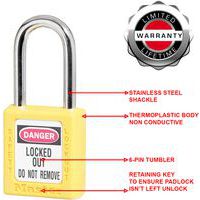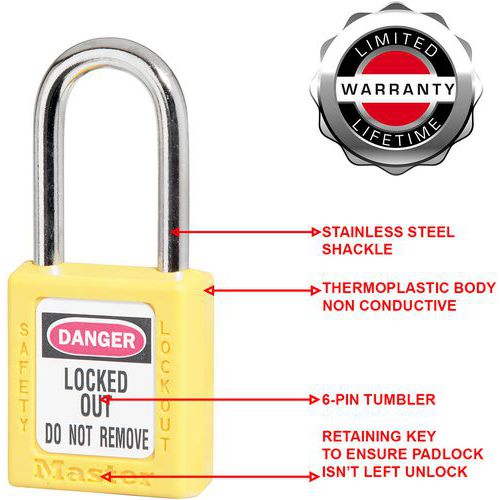 Thermoplastisch lockouthangslot en stalen handgreep Ø 6 mm voor mechanische installaties. Geschikt voor sites en gebieden geclassificeerd ATEX. Met sleutelhouder. Denk aan de LIFEGUARD-service: gratis service voor het registreren van sleutelnummers die door een bedrijf worden gebruikt om ervoor te zorgen dat uw teams geen dubbele sleutels hebben! Laat het ons weten bij het bestellen.