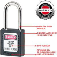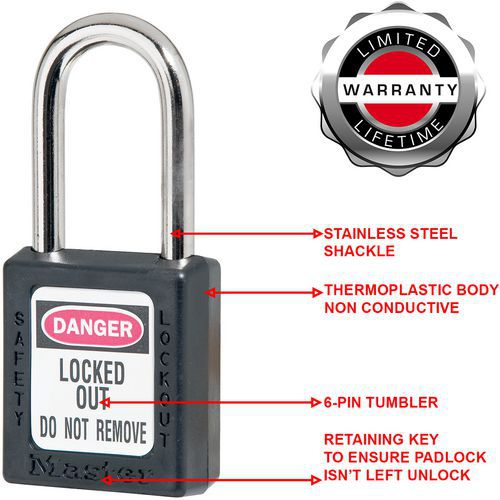 Thermoplastisch lockouthangslot en stalen handgreep Ø 6 mm voor mechanische installaties. Geschikt voor sites en gebieden geclassificeerd ATEX. Met sleutelhouder. Denk aan de LIFEGUARD-service: gratis service voor het registreren van sleutelnummers die door een bedrijf worden gebruikt om ervoor te zorgen dat uw teams geen dubbele sleutels hebben! Laat het ons weten bij het bestellen.