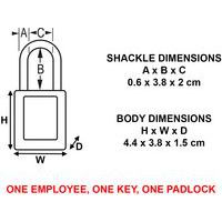 Veiligheidshangslot, Kleur: Zwart, Breedte: 38 mm, Hoogte: 4.4 cm, Beugel Ø: 6 mm Veiligheidshangslot, Kleur: Zwart, Breedte: 38 mm, Hoogte: 4.4 cm, Beugel Ø: 6 mm