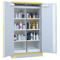 Veiligheidskast die geschikt is voor diverse risico's en voldoet aan de norm EN 14470-1. Beschikt over een brandwerendheid van 30 min. Met vakken om niet-compatibele chemische producten gescheiden te houden. Sleutelslot op 3 punten met vonkvrije vergrendeling. Ventilatieopeningen voor aansluiting op een ventilatievoorziening. Dichtingen voor deur die uitzetten bij warmte Stelpoten voor hoogteregeling Ventilatieleidingen met smeltsysteem. Getest en gehomologeerd volgens norm FM 6050.