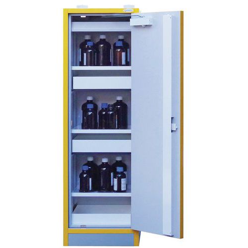 Veiligheidskast die geschikt is voor diverse risico's en voldoet aan de norm EN 14470-1. Beschikt over een brandwerendheid van 30 min. Met vakken om niet-compatibele chemische producten gescheiden te houden. Sleutelslot op 3 punten met vonkvrije vergrendeling. Ventilatieopeningen voor aansluiting op een ventilatievoorziening. Dichtingen voor deur die uitzetten bij warmte Stelpoten voor hoogteregeling Ventilatieleidingen met smeltsysteem. Getest en gehomologeerd volgens norm FM 6050.