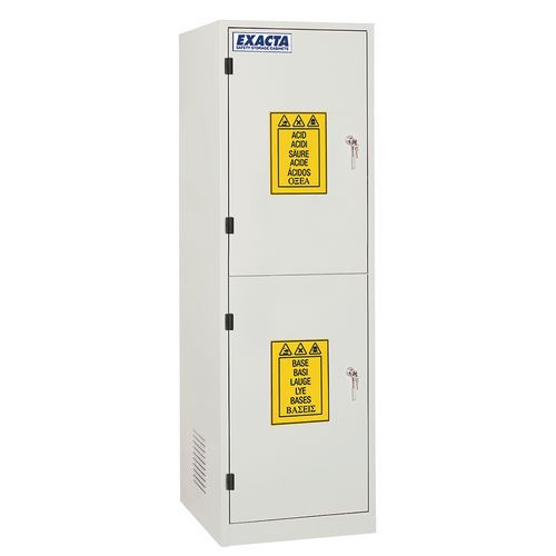 Veiligheidskasten voor de opslag van chemische producten, zuren of basen. Verdeling van boven op elkaar geplaatste vakken, voor het afzonderlijk opslaan van de verschillende soorten niet ontvlambare chemische producten. Vakken met in hoogte verstelbare legborden van gelakt staal en rvs, met vaste opvang. Gesloten draaideuren, enkelwandig. Slot met sleutel. Conform norm EN16121 SEVERAL. Constructie uit één stuk van robuust plaatstaal.
