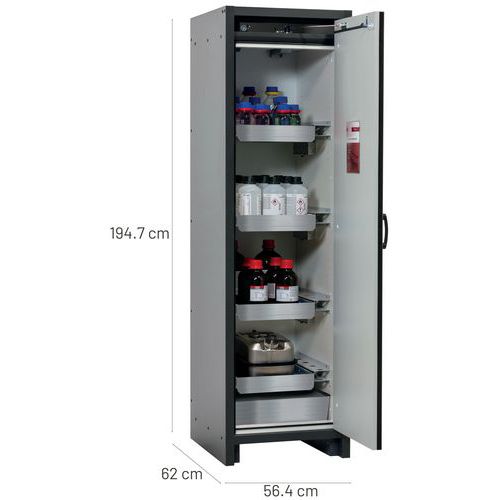 Veilige opslag, voldoet aan de geldende regelgeving voor gevaarlijke, ontvlambare producten in werkruimtes Robuust en duurzaam: stevige constructie aan de buitenzijde van brandwerende platen met een coating van melaminehars 3 bevestigingsscharnieren per deur, volledig sluitmechanisme en beveiligingselementen ter bescherming tegen corrosie, gemonteerd buiten de opslagruimte hoogwaardige deur, krasbestendig, met gestructureerd oppervlak met epoxy-coating Ergonomisch: de deur blijft in de stand staan bij het openen, automatische sluiting in geval van brand Gecontroleerd gebruik: vergrendelbare deur, compatibel met centrale vergrendeling Eenvoudig transport: geïntegreerde transportsokkel, eenvoudig afgewerkte plint of plint met 4 nivelleringsvoeten optioneel beschikbaar Beluchting en ontluchting: ingebouwd beluchtings- en ventilatiesysteem voor aansluiting (diameter 75 mm) op een technisch luchtafvoersysteem Getest en gecertificeerd conform de Amerikaanse norm FM 6050 - Max. belasting (kg) : 600 kg