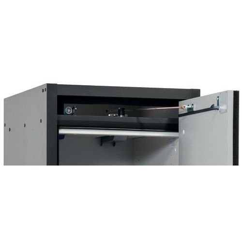 Veilige opslag, voldoet aan de geldende regelgeving voor gevaarlijke, ontvlambare producten in werkruimtes Robuust en duurzaam: stevige constructie aan de buitenzijde van brandwerende platen met een coating van melaminehars 3 bevestigingsscharnieren per deur, volledig sluitmechanisme en beveiligingselementen ter bescherming tegen corrosie, gemonteerd buiten de opslagruimte hoogwaardige deur, krasbestendig, met gestructureerd oppervlak met epoxy-coating Ergonomisch: de deur blijft in de stand staan bij het openen, automatische sluiting in geval van brand Gecontroleerd gebruik: vergrendelbare deur, compatibel met centrale vergrendeling Eenvoudig transport: geïntegreerde transportsokkel, eenvoudig afgewerkte plint of plint met 4 nivelleringsvoeten optioneel beschikbaar Beluchting en ontluchting: ingebouwd beluchtings- en ventilatiesysteem voor aansluiting (diameter 75 mm) op een technisch luchtafvoersysteem Getest en gecertificeerd conform de Amerikaanse norm FM 6050 -