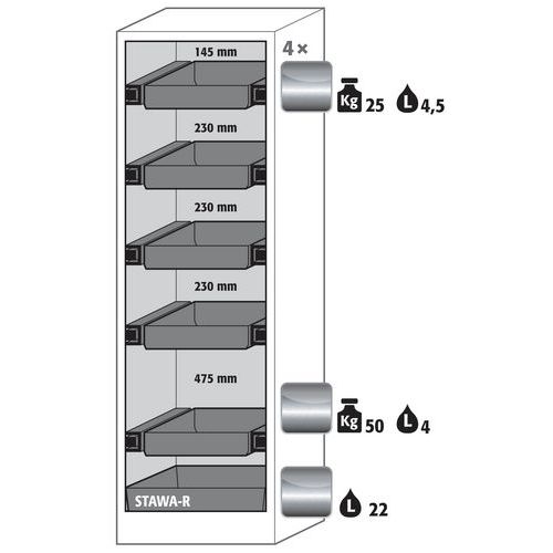 Veilige opslag, voldoet aan de geldende regelgeving voor gevaarlijke, ontvlambare producten in werkruimtes Robuust en duurzaam: stevige constructie aan de buitenzijde van brandwerende platen met een coating van melaminehars 3 bevestigingsscharnieren per deur, volledig sluitmechanisme en beveiligingselementen ter bescherming tegen corrosie, gemonteerd buiten de opslagruimte hoogwaardige deur, krasbestendig, met gestructureerd oppervlak met epoxy-coating Ergonomisch: de deur blijft in de stand staan bij het openen, automatische sluiting in geval van brand Gecontroleerd gebruik: vergrendelbare deur, compatibel met centrale vergrendeling Eenvoudig transport: geïntegreerde transportsokkel, eenvoudig afgewerkte plint of plint met 4 nivelleringsvoeten optioneel beschikbaar Beluchting en ontluchting: ingebouwd beluchtings- en ventilatiesysteem voor aansluiting (diameter 75 mm) op een technisch luchtafvoersysteem Getest en gecertificeerd conform de Amerikaanse norm FM 6050 - Max. belasting (kg) : 600 kg
