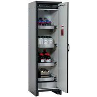 Veilige opslag, voldoet aan de geldende regelgeving voor gevaarlijke, ontvlambare producten in werkruimtes Robuust en duurzaam: stevige constructie aan de buitenzijde van brandwerende platen met een coating van melaminehars 3 bevestigingsscharnieren per deur, volledig sluitmechanisme en beveiligingselementen ter bescherming tegen corrosie, gemonteerd buiten de opslagruimte hoogwaardige deur, krasbestendig, met gestructureerd oppervlak met epoxy-coating Ergonomisch: de deur blijft in de stand staan bij het openen, automatische sluiting in geval van brand Gecontroleerd gebruik: vergrendelbare deur, compatibel met centrale vergrendeling Eenvoudig transport: geïntegreerde transportsokkel, eenvoudig afgewerkte plint of plint met 4 nivelleringsvoeten optioneel beschikbaar Beluchting en ontluchting: ingebouwd beluchtings- en ventilatiesysteem voor aansluiting (diameter 75 mm) op een technisch luchtafvoersysteem Getest en gecertificeerd conform de Amerikaanse norm FM 6050 - Gemaakt in Duitsland Max. belasting (kg) : 600 kg