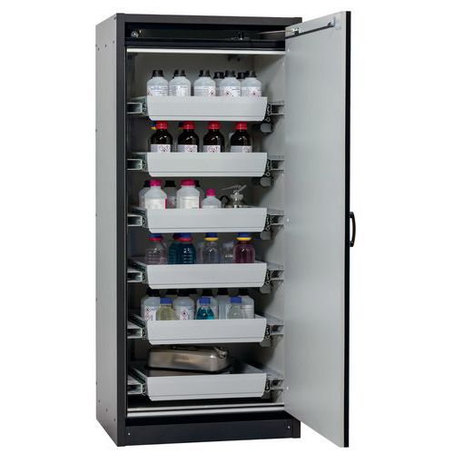 Veilige opslag, voldoet aan de geldende regelgeving voor gevaarlijke, ontvlambare producten in werkruimtes Robuust en duurzaam: Stevige constructie aan de buitenzijde van brandwerende platen met een coating van melaminehars 3 bevestigingsscharnieren per deur, volledig sluitmechanisme en beveiligingselementen ter bescherming tegen corrosie, gemonteerd buiten de opslagruimte hoogwaardige deur, krasbestendig, met gestructureerd oppervlak met epoxy-coating Ergonomisch: de deur blijft in de stand staan bij het openen, automatische sluiting in geval van brand Gecontroleerd gebruik: vergrendelbare deur, compatibel met centrale vergrendeling Eenvoudig transport: geïntegreerde transportsokkel, eenvoudig afgewerkte plint of plint met 4 nivelleringsvoeten optioneel beschikbaar Beluchting en ontluchting: ingebouwd beluchtings- en ventilatiesysteem voor aansluiting (diameter 75 mm) op een technisch luchtafvoersysteem Getest en gecertificeerd conform de Amerikaanse norm FM 6050 - Gemaakt in Duitsland Max. belasting (kg) : 600 kg