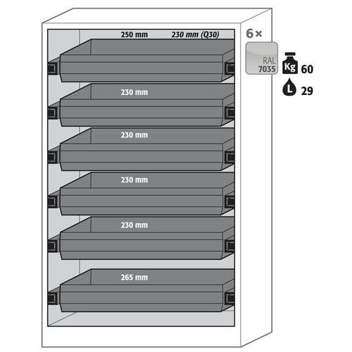 Veilige opslag, voldoet aan de geldende regelgeving voor gevaarlijke, ontvlambare producten in werkruimten Robuust en duurzaam: Stevige constructie aan de buitenzijde van brandwerende platen met een coating van melaminehars 3 bevestigingsscharnieren per deur, volledig sluitmechanisme en beveiligingselementen ter bescherming tegen corrosie, gemonteerd buiten de opslagruimte hoogwaardige deur, Krasbestendig, met gestructureerd oppervlak met epoxy-coating Ergonomisch: de deur blijft in de stand staan bij het openen, automatische sluiting in geval van brand Gecontroleerd gebruik: vergrendelbare deur, compatibel met centrale vergrendeling Eenvoudig transport: geïntegreerde transportsokkel, eenvoudig afgewerkte plint of plint met 4 nivelleringsvoeten optioneel beschikbaar Beluchting en ontluchting: ingebouwd beluchtings- en ventilatiesysteem voor aansluiting (diameter 75 mm) op een technisch luchtafvoersysteem Getest en gecertificeerd conform de Amerikaanse norm FM 6050 - Gemaakt in Duitsland Max. belasting (kg) : 600 kg