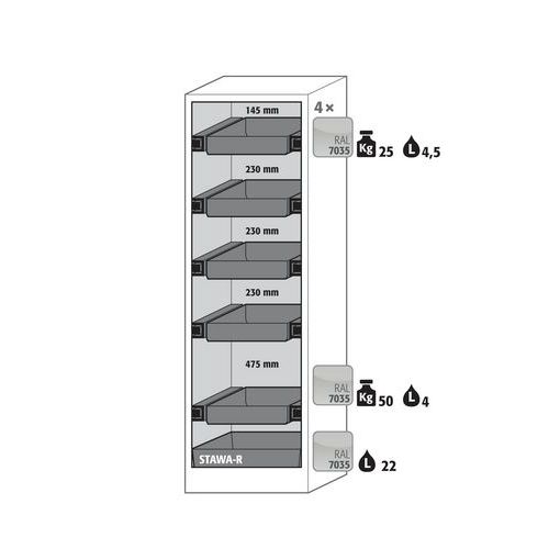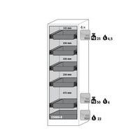 Veilige opslag van gevaarlijke producten, ontvlambare stoffen in de werkruimtes. Robuust en duurzaam, waardoor de structuur van de buitenkant scherper en beter bestand is tegen stralen. Pluscompartimenten die de opslag van verschillende stoffen mogelijk maken die gevaarlijk zijn in een grote kast. Ergonomisch met het onderhoud van de poorten in een goede positie, automatisch verwarmen in geval van brand. Afsluitbare deuren, compatibel met centrale vergrendeling, deurslotindicator (rood/groen) voor gecontroleerd gebruik. Eenvoudig transport door geïntegreerde transportonderstel. Eenvoudige installatie met geïntegreerde verstelbare voeten. Beluchtings- en ventilatiesysteem voor aansluiting op een afzuig- of onafhankelijk gefilterd ventilatiesysteem, propeller op het evacuatierooster die een ventilatie aangeeft. Gemaakt in Duitsland Gemaakt in Duitsland Max. belasting (kg) : 600 kg