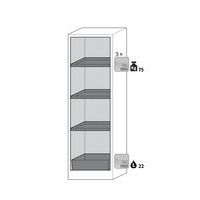 Veilige opslag, voldoet aan de geldende regelgeving voor gevaarlijke, ontvlambare producten in werkruimtes Robuust en duurzaam: Stevige constructie aan de buitenzijde van brandwerende platen met een coating van melaminehars 3 bevestigingsscharnieren per deur volledig sluitmechanisme en beveiligingselementen ter bescherming tegen corrosie, gemonteerd buiten de opslagruimte hoogwaardige deur, krasbestendig, met gestructureerd oppervlak met epoxy-coating Ergonomisch: de deur blijft in de stand staan bij het openen, automatische sluiting in geval van brand Gecontroleerd gebruik: vergrendelbare deur, compatibel met centrale vergrendeling Eenvoudig transport: geïntegreerde transportsokkel, eenvoudig afgewerkte plint of plint met 4 nivelleringsvoeten optioneel beschikbaar Beluchting en ontluchting: ingebouwd beluchtings- en ventilatiesysteem voor aansluiting (diameter 75 mm) op een technisch luchtafvoersysteem Getest en gecertificeerd conform de Amerikaanse norm FM 6050 Beluchting en ventilatie: Beluchting en ventilatiesysteem voor aansluiting op een autonoom afzuig- of gefilterd ventilatiesysteem, helix op het uitblaasrooster dat ventilatie aangeeft Gemaakt in Duitsland Max. belasting (kg) : 600 kg