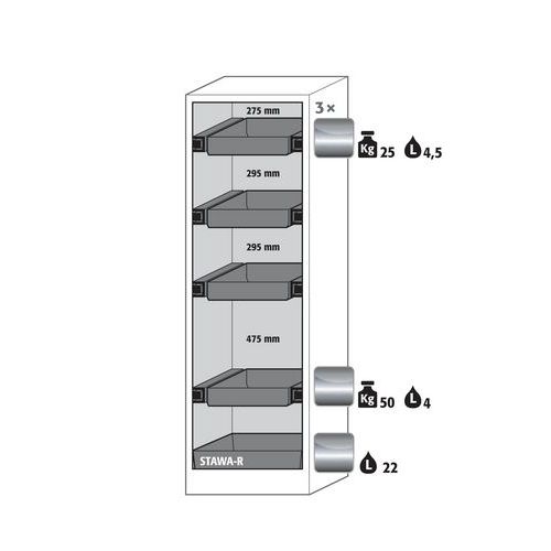 Veilige opslag, voldoet aan de geldende regelgeving voor gevaarlijke, ontvlambare producten in werkruimtes Robuust en duurzaam: Stevige constructie aan de buitenzijde van brandwerende platen met een coating van melaminehars 3 bevestigingsscharnieren per deur volledig sluitmechanisme en beveiligingselementen ter bescherming tegen corrosie, gemonteerd buiten de opslagruimte hoogwaardige deur, krasbestendig, met gestructureerd oppervlak met epoxy-coating Ergonomisch: de deur blijft in de stand staan bij het openen, automatische sluiting in geval van brand Gecontroleerd gebruik: vergrendelbare deur, compatibel met centrale vergrendeling Eenvoudig transport: geïntegreerde transportsokkel, eenvoudig afgewerkte plint of plint met 4 nivelleringsvoeten optioneel beschikbaar Beluchting en ontluchting: ingebouwd beluchtings- en ventilatiesysteem voor aansluiting (diameter 75 mm) op een technisch luchtafvoersysteem Getest en gecertificeerd conform de Amerikaanse norm FM 6050 Beluchting en ventilatie: Beluchting en ventilatiesysteem voor aansluiting op een autonoom afzuig- of gefilterd ventilatiesysteem, helix op het uitblaasrooster dat ventilatie aangeeft Gemaakt in Duitsland Max. belasting (kg) : 600 kg