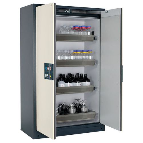 Veilige opslag, voldoet aan de geldende regelgeving voor gevaarlijke, ontvlambare producten in werkruimtes Robuust en duurzaam: Stevige constructie aan de buitenzijde van brandwerende platen met een coating van melaminehars 3 bevestigingsscharnieren per deur volledig sluitmechanisme en beveiligingselementen ter bescherming tegen corrosie, gemonteerd buiten de opslagruimte hoogwaardige deur, krasbestendig, met gestructureerd oppervlak met epoxy-coating Ergonomisch: de deur blijft in de stand staan bij het openen, automatische sluiting in geval van brand Gecontroleerd gebruik: vergrendelbare deur, compatibel met centrale vergrendeling Eenvoudig transport: geïntegreerde transportsokkel, eenvoudig afgewerkte plint of plint met 4 nivelleringsvoeten optioneel beschikbaar Beluchting en ontluchting: ingebouwd beluchtings- en ventilatiesysteem voor aansluiting (diameter 75 mm) op een technisch luchtafvoersysteem Getest en gecertificeerd conform de Amerikaanse norm FM 6050 Beluchting en ventilatie: Beluchting en ventilatiesysteem voor aansluiting op een autonoom afzuig- of gefilterd ventilatiesysteem, helix op het uitblaasrooster dat ventilatie aangeeft Gemaakt in Duitsland Max. belasting (kg) : 600 kg