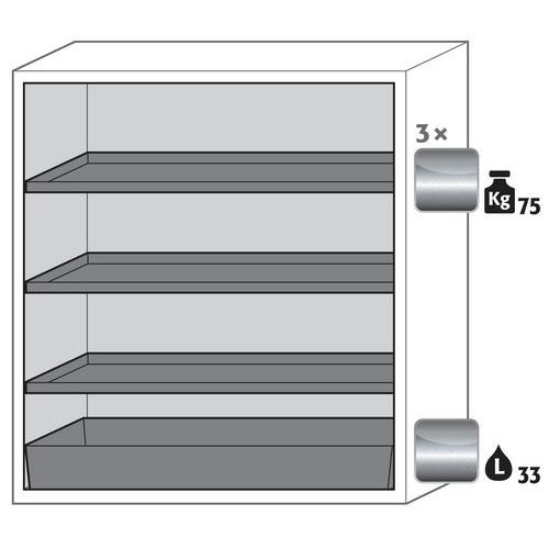 Veilige opslag van gevaarlijke producten, ontvlambare stoffen in de werkruimtes. Robuust en duurzaam dankzij de solide stalen buitensturctuur. Grotere compartimenten zorgen voor een opslag van stoffen die gevaarlijk zijn voor ontvlambare en bijtende stoffen in een grote kast. Comfort van het werk, de deur blijft in de stand staan bij het openen. Deuren zijn beschikbaar met een gecentraliseerd fermetuursysteem voor een gebruikscontrole. Eenvoudige installatie met geïntegreerde verstelbare voeten. Geïntegreerd ventilatie- en ventilatiesysteem voor aansluiting (diameter 75 mm) op een technisch luchtafvoerapparaat. Gemaakt in Duitsland Klantgarantie : 5 jaar Max. belasting (kg) : 600