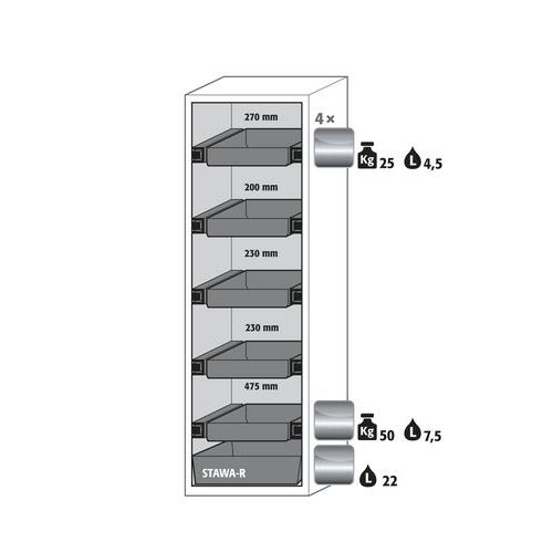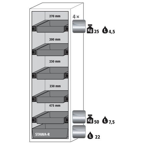 Veilige opslag van gevaarlijke producten, ontvlambare stoffen in de werkruimtes. Robuust en duurzaam dankzij de solide stalen buitenstructuur. Grotere compartimenten zorgen voor een opslag van stoffen die gevaarlijk zijn voor ontvlambare en bijtende stoffen in een grote kast. Werkcomfort door automatisch sluitende deuren. Houd deuren in geopende stand, veilige opslag van containers. Afsluitbare deuren met centraal sluitsysteem voor gecontroleerd gebruik. Eenvoudige montage door geïntegreerde stelpoten. Geïntegreerd ventilatie- en ventilatiesysteem voor aansluiting (diameter 75 mm) op een technisch luchtafvoerapparaat. Gemaakt in Duitsland Gemaakt in Duitsland Max. belasting (kg) : 600 kg