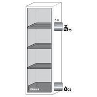 Veilige opslag van gevaarlijke producten, ontvlambare stoffen in de werkruimtes. Robuust en duurzaam dankzij de solide stalen buitensturctuur. Grotere compartimenten zorgen voor een opslag van stoffen die gevaarlijk zijn voor ontvlambare en bijtende stoffen in een grote kast. Comfort van het werk, de deur blijft in de stand staan bij het openen. Deuren zijn beschikbaar met een gecentraliseerd sluitsysteem voor gecontroleerd gebruik. Eenvoudige installatie door geïntegreerde stelpoten. Geïntegreerd ventilatie- en ventilatiesysteem voor aansluiting (diameter 75 mm) op een technisch luchtafvoerapparaat. Gemaakt in Duitsland Max. belasting (kg) : 600 Klantgarantie : 5 jaar