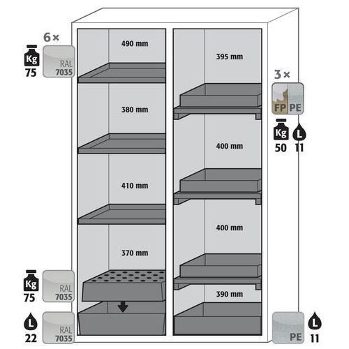 Veilige opslag van gevaarlijke producten, ontvlambare stoffen in de werkruimtes. Robuust en duurzaam dankzij de solide stalen buitensturctuur. Grotere compartimenten zorgen voor een opslag van stoffen die gevaarlijk zijn voor ontvlambare en bijtende stoffen in een grote kast. Comfort van het werk, de deur blijft in de stand staan bij het openen. Deuren zijn beschikbaar met een gecentraliseerd fermetuursysteem voor een gebruikscontrole. Eenvoudige installatie met geïntegreerde verstelbare voeten. Geïntegreerd ventilatie- en ventilatiesysteem voor aansluiting (diameter 75 mm) op een technisch luchtafvoerapparaat. Gemaakt in Duitsland Max. belasting (kg) : 600