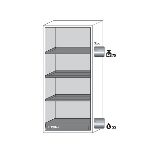 Veilige opslag, voldoet aan de geldende regelgeving voor gevaarlijke, ontvlambare producten in werkruimtes Robuust en duurzaam: Stevige constructie aan de buitenzijde van brandwerende platen met een coating van melaminehars 3 bevestigingsscharnieren per deur volledig sluitmechanisme en beveiligingselementen ter bescherming tegen corrosie, gemonteerd buiten de opslagruimte hoogwaardige deur, krasbestendig, met gestructureerd oppervlak met epoxy-coating Ergonomisch: de deur blijft in de stand staan bij het openen, automatische sluiting in geval van brand Gecontroleerd gebruik: vergrendelbare deur, compatibel met centrale vergrendeling Eenvoudig transport: geïntegreerde transportsokkel, eenvoudig afgewerkte plint of plint met 4 nivelleringsvoeten optioneel beschikbaar Beluchting en ontluchting: ingebouwd beluchtings- en ventilatiesysteem voor aansluiting (diameter 75 mm) op een technisch luchtafvoersysteem Getest en gecertificeerd conform de Amerikaanse norm FM 6050 - Gemaakt in Duitsland Max. belasting (kg) : 600 kg