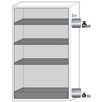 Veilige opslag, voldoet aan de geldende regelgeving voor gevaarlijke, ontvlambare producten in werkruimtes Robuust en duurzaam: Stevige constructie aan de buitenzijde van brandwerende platen met een coating van melaminehars 3 bevestigingsscharnieren per deur volledig sluitmechanisme en beveiligingselementen ter bescherming tegen corrosie, gemonteerd buiten de opslagruimte hoogwaardige deur, krasbestendig, met gestructureerd oppervlak met epoxy-coating Ergonomisch: de deur blijft in de stand staan bij het openen, automatische sluiting in geval van brand Gecontroleerd gebruik: vergrendelbare deur, compatibel met centrale vergrendeling Eenvoudig transport: geïntegreerde transportsokkel, eenvoudig afgewerkte plint of plint met 4 nivelleringsvoeten optioneel beschikbaar Beluchting en ontluchting: ingebouwd beluchtings- en ventilatiesysteem voor aansluiting (diameter 75 mm) op een technisch luchtafvoersysteem Getest en gecertificeerd conform de Amerikaanse norm FM 6050 Eenvoudige installatie: geïntegreerde stelvoeten Ventilatie en ventilatie: geïntegreerd ventilatie- en ventilatiesysteem voor aansluiting (diameter 75 mm) op een technisch luchtafvoerapparaat Gemaakt in Duitsland Max. belasting (kg) : 600 kg
