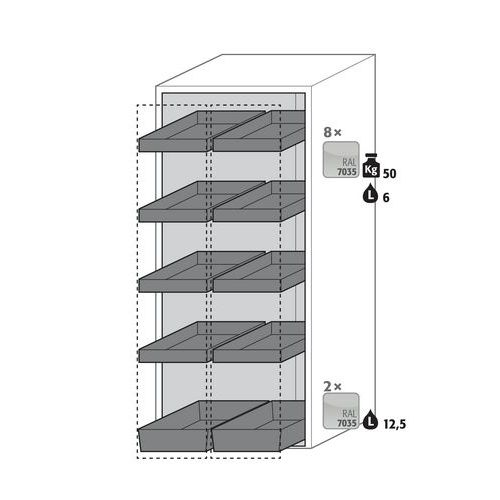 Veilige opslag van gevaarlijke producten, ontvlambare stoffen in de werkruimtes. Robuuste, duurzame constructie met een stabiel, hoogwaardig, krasbestendige ombouw van de kast. Verticale lade(s) openen en sluiten met een druk op de knop. De verticale lade(s) zorgen voor overzicht en gemakkelijke toegang tot opgeslagen producten. Standaard sluiting na circa 60 seconden met optisch en akoestisch signaal dat ladesluiting aangeeft. Geen onbevoegd gebruik dankzij afsluitbare verticale lade(s) met cilinderslot (integratie in een bestaand sluitsysteem mogelijk) en vergrendelingsstatusindicator (rood/groen). Eenvoudige montage door geïntegreerde stelpoten.