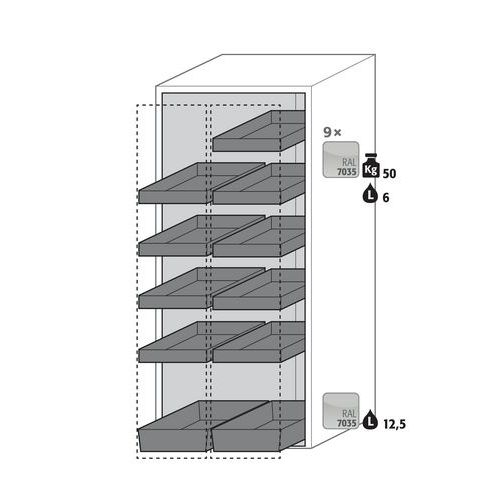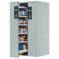 Veilige opslag van gevaarlijke producten, ontvlambare stoffen in de werkruimtes. Robuuste, duurzame constructie met een stabiel, hoogwaardig, krasbestendige ombouw van de kast. Verticale lade(s) openen en sluiten met een druk op de knop. De verticale lade(s) zorgen voor overzicht en gemakkelijke toegang tot opgeslagen producten. Standaard sluiting na circa 60 seconden met optisch en akoestisch signaal dat ladesluiting aangeeft. Geen onbevoegd gebruik dankzij afsluitbare verticale lade(s) met cilinderslot (integratie in een bestaand sluitsysteem mogelijk) en vergrendelingsstatusindicator (rood/groen). Eenvoudige montage door geïntegreerde stelpoten.