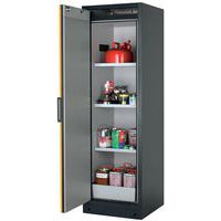 Veilige opslag voor brandbare producten. Bestand tegen krassen, epoxylak. Sluiting beschermd tegen corrosie. Ergonomisch: de deuren kunnen in elke stand geopend worden gehouden, automatische sluiting in geval van brand. Gecontroleerd gebruik: deuren afsluitbaar met centrale vergrendeling. Indicator voor vergrendeling van de deuren (rood/groen). Eenvoudig transport en installatie: geïntegreerde transportsokkel en verstelbare poten. Luchtverversing en ventilatie: autonoom systeem voor luchtverversing en gefilterde ventilatie.