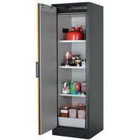 Veiligheidskast Q-CLASSIC-90 Model Q90.195.090. Grijs antraciet (RAL 7016), met signaalgele draaideuren (RAL 1004). Veilige opslag, voldoet aan de geldende regelgeving voor gevaarlijke, ontvlambare substanties in werkruimtes. Ventilatiepropeller op het afvoerrooster.