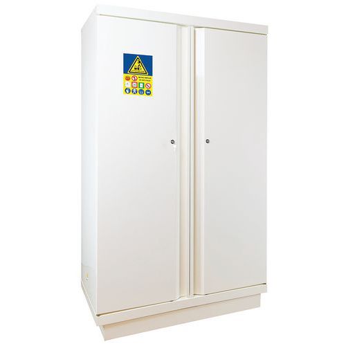 Veiligheidskast voor de opslag van lithium accu's, ter bescherming van goederen en personen.
