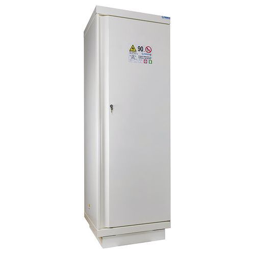 Veiligheidskast met verschillende indelingsmogelijkheden van de vakken, zodat niet-compatibele producten apart opgeslagen kunnen worden. Bevestigingspunt voor aarding. Slot met sleutel. Ventilatieopeningen voor aansluiting op een ventilatievoorziening. Brandwerend gedurende 90 minuten en getest tot 105 minuten.