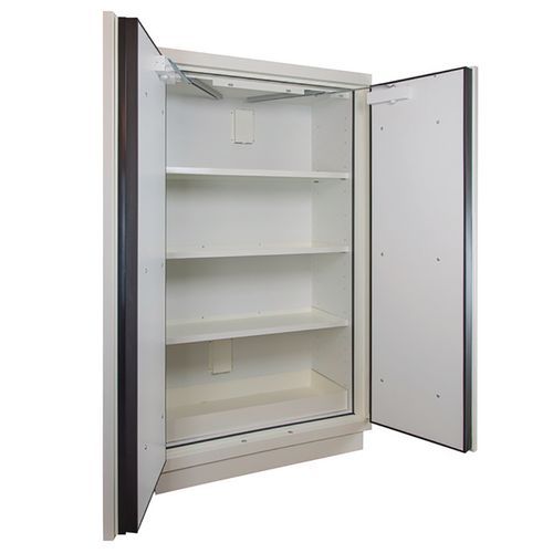 Veiligheidskast met sleutelslot. Handgreep over de gehele hoogte van de kast voor een betere ergonomie en eenvoudig openen. Ventilatieopeningen voor aansluiting op een ventilatievoorziening. Opvanglegborden verstelbaar om de 6,4 cm. Voldoet aan de normen EN14470-1 en FM 6050. Deuren met dichtingen die uitzetten bij warmte. Bevestigingspunt voor aarding. Brandwerend gedurende 90 minuten en getest tot 105 minuten.