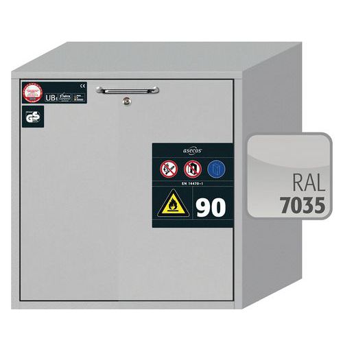 Veilige opslag, voldoet aan de geldende regelgeving voor gevaarlijke, ontvlambare producten in werkruimtes Robuust en duurzaam: Stevige constructie aan de buitenzijde van brandwerende platen met een coating van melaminehars 3 bevestigingsscharnieren per deur volledig sluitmechanisme en beveiligingselementen ter bescherming tegen corrosie, gemonteerd buiten de opslagruimte hoogwaardige deur, krasbestendig, met gestructureerd oppervlak met epoxy-coating Ergonomisch: de deur blijft in de stand staan bij het openen, automatische sluiting in geval van brand Gecontroleerd gebruik: vergrendelbare deur, compatibel met centrale vergrendeling Eenvoudig transport: geïntegreerde transportsokkel, eenvoudig afgewerkte plint of plint met 4 nivelleringsvoeten optioneel beschikbaar Beluchting en ontluchting: ingebouwd beluchtings- en ventilatiesysteem voor aansluiting (diameter 75 mm) op een technisch luchtafvoersysteem Getest en gecertificeerd conform de Amerikaanse norm FM 6050 -