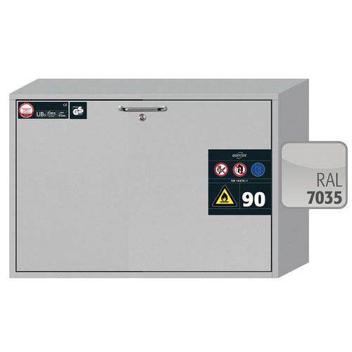 Veilige opslag, voldoet aan de geldende regelgeving voor gevaarlijke, ontvlambare producten in werkruimtes Robuust en duurzaam: Stevige constructie aan de buitenzijde van brandwerende platen met een coating van melaminehars 3 bevestigingsscharnieren per deur volledig sluitmechanisme en beveiligingselementen ter bescherming tegen corrosie, gemonteerd buiten de opslagruimte hoogwaardige deur, krasbestendig, met gestructureerd oppervlak met epoxy-coating Ergonomisch: de deur blijft in de stand staan bij het openen, automatische sluiting in geval van brand Gecontroleerd gebruik: vergrendelbare deur, compatibel met centrale vergrendeling Eenvoudig transport: geïntegreerde transportsokkel, eenvoudig afgewerkte plint of plint met 4 nivelleringsvoeten optioneel beschikbaar Beluchting en ontluchting: ingebouwd beluchtings- en ventilatiesysteem voor aansluiting (diameter 75 mm) op een technisch luchtafvoersysteem Getest en gecertificeerd conform de Amerikaanse norm FM 6050 - Gemaakt in Duitsland