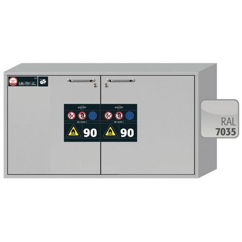 Veilige opslag, voldoet aan de geldende regelgeving voor gevaarlijke, ontvlambare producten in werkruimtes Robuust en duurzaam: Stevige constructie aan de buitenzijde van brandwerende platen met een coating van melaminehars 3 bevestigingsscharnieren per deur volledig sluitmechanisme en beveiligingselementen ter bescherming tegen corrosie, gemonteerd buiten de opslagruimte hoogwaardige deur, krasbestendig, met gestructureerd oppervlak met epoxy-coating Ergonomisch: de deur blijft in de stand staan bij het openen, automatische sluiting in geval van brand Gecontroleerd gebruik: vergrendelbare deur, compatibel met centrale vergrendeling Eenvoudig transport: geïntegreerde transportsokkel, eenvoudig afgewerkte plint of plint met 4 nivelleringsvoeten optioneel beschikbaar Beluchting en ontluchting: ingebouwd beluchtings- en ventilatiesysteem voor aansluiting (diameter 75 mm) op een technisch luchtafvoersysteem Getest en gecertificeerd conform de Amerikaanse norm FM 6050 - Gemaakt in Duitsland