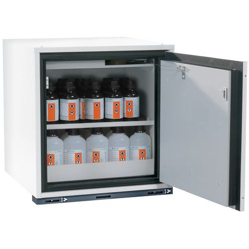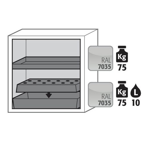 Veilige opslag, voldoet aan de geldende regelgeving voor gevaarlijke, ontvlambare producten in werkruimtes Functie / constructie: Robuust en duurzaam: stalen constructie aan de buitenkant met epoxy-coating Werkcomfort: de deuren zijn in alle posities geblokkeerd, veilige toegang tot alle containers – openingshoek van de deuren 93°, binnenkant van de kast is volledig zichtbaar Gecontroleerd gebruik: vergrendelbare deuren slot, indicator voor deurvergrendeling (rood/groen) Mobiel: optionele sokkel met wielen, voor eenvoudig verplaatsen van de kast Beluchting en ontluchting: ingebouwd beluchtings- en ventilatiesysteem voor aansluiting (diameter 50 mm) op een technisch luchtafvoersysteem Max. belasting (kg) : 600 kg
