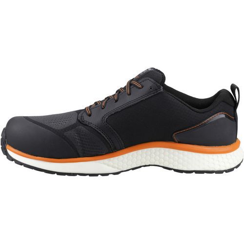 Veiligheidsschoen Reaxion Trainer 2.0 S3 SRC ESD voor heren - Timberland Pro. Veiligheidsneus en antiperforatiezool voor een volledige bescherming. Anti-vermoeiheid™- en Aerocore™-technologieën voor optimaal comfort gedurende de hele dag. Buitenzool SRC-antislip voor een uitstekende grip. Model met ESD-certificering voor omgevingen die gevoelig zijn voor elektrostatische ontlading.