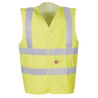 Vest voor goede zichtbaarheid zonder mouwen, V-hals. Sluiting met klittenband. Brandwerende reflecterende banden (50 mm). Antistatisch en slipvast. Doorgestikte naden.