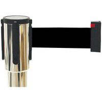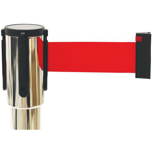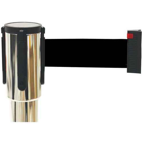 Paal met uittrekbare band en 3 aanhaakpunten. Uittrekbare band met zelfremmend systeem: trekt niet opeens hard in bij het losmaken. Sokkel met rubberen poten voor meer stabiliteit. Mogelijkheid om de palen aan elkaar vast te maken.