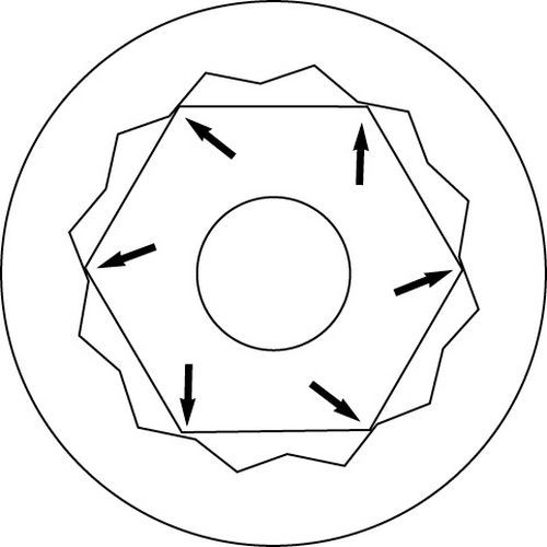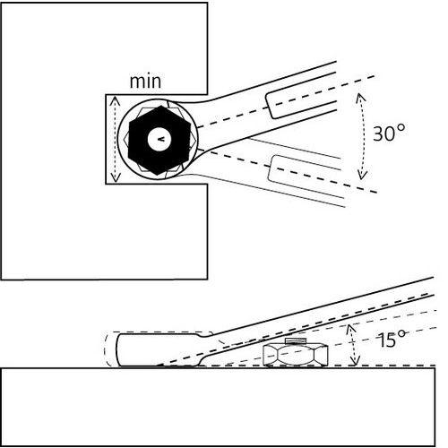 Twaalfkantoog OGV®-profiel voor meer vermogen en een langere levensduur. Verdiepte sleutel met terugstelhoek van 30°. Dunne kop voor een betere toegankelijkheid. Het OGV-profiel vermindert de belasting dankzij de grote contactoppervlakken en de afwezigheid van scherpe hoeken in het gereedschap. De aandrijving wordt door de zijden van de moer verzorgd: de hoeken worden niet belast, de sleutel heeft een langere levensduur.