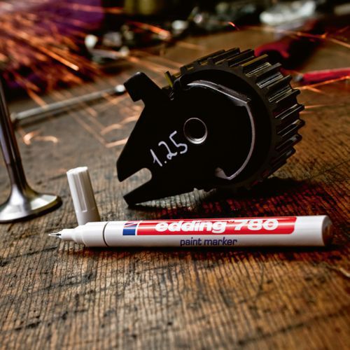 Markeerstift verf - Edding 780 voor een zeer dekkend en permanent schrift, zelfs op donkere of transparante materialen. Markering op metaal, glas, kunststof, etc. en in het bijzonder op alle gladde oppervlakken. Verf droogt snel, reukloos. Water-, licht- en hittebestendig tot 400 °c (1000 °C voor bepaalde kleuren zoals wit, geel, zilverkleurig) en bestand tegen afschuring. Door ventiel gecontroleerde inktstroom.