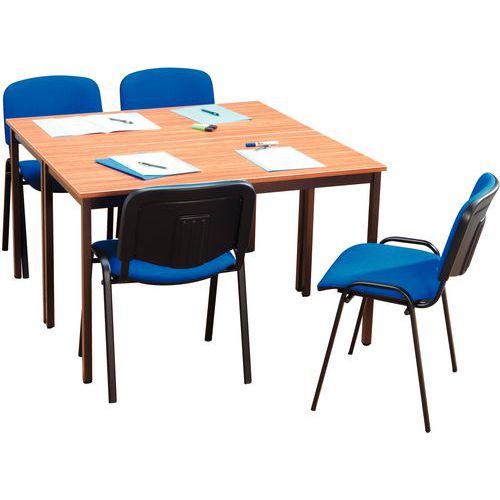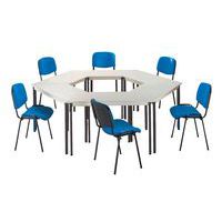 | Productnaam | Vergaderset: 6 tafels en 6 stoelen, Hoogte: 74 cm, Vorm: Trapeze, Tafelblad kleur: Grijs, Stoel kleur: Blauw |