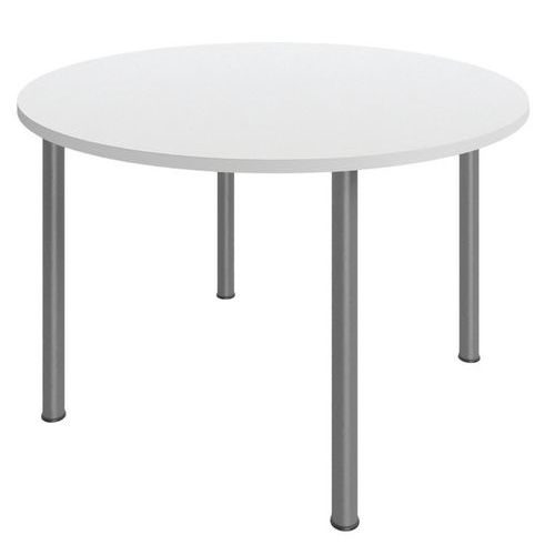 Met deze ronde tafel kan een kleine vergaderruimte in een bureau worden gecreëerd. Spaanplaat van hout met hoge dichtheid, dikte 25 mm. Schokbestendige ABS-randen van 2 mm. Poten voorzien van steldoppen (slag 10 mm) om oneffenheden in de ondergrond te compenseren. Ronde tafel met 2 afmetingen naar keuze: Diameter 100 of 120 cm. 4 cilindrische poten van metaal met gelakte epoxycoating. Monteerklaar geleverd met handleiding. Montage : Zelfbouw