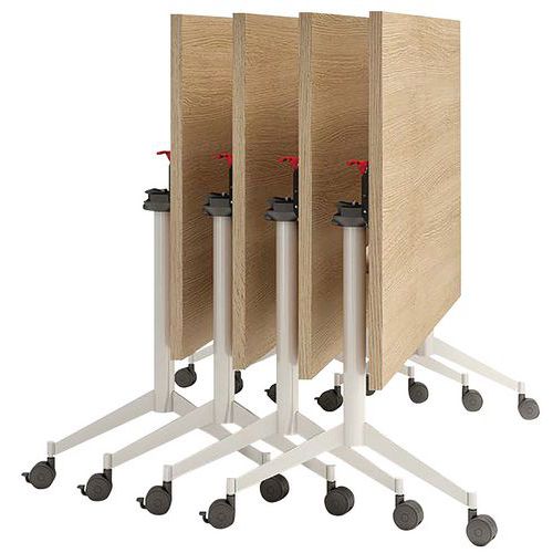 Rechthoekige vergadertafel met eenvoudig inklapsysteem. Verticaal roterend voor optimaal gebruik van de ruimte bij het opbergen van uw tafel. Het wiel is eenvoudig te richten, met ingebouwde rem op elk wiel. Ideaal voor coworkingruimtes en het werken in teamverband