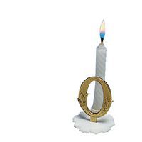 Witte kaars gemonteerd op een witte kunststof houder waarop een gouden cijfer is bevestigd.